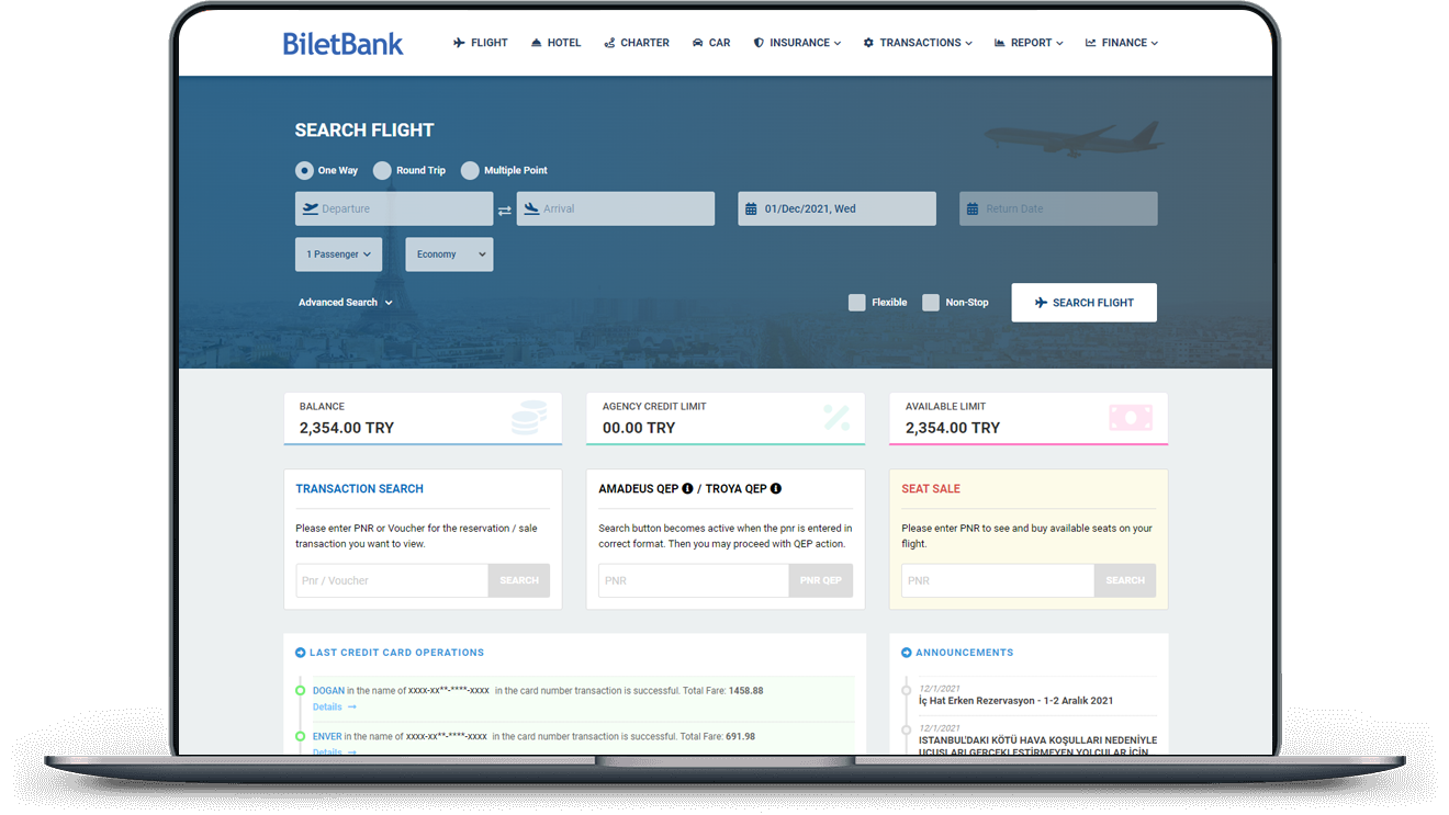 Technoly is a leading company that offers a user-friendly, reliable and accessible ticket sales and distribution system. Through the Flight Ticket API, it makes the sale and distribution of hundreds of domestic and international scheduled and low-cost airline tickets, as well as the sale and distribution of Charter companies’ tickets for the use of travel agencies.